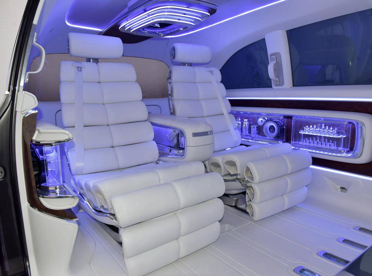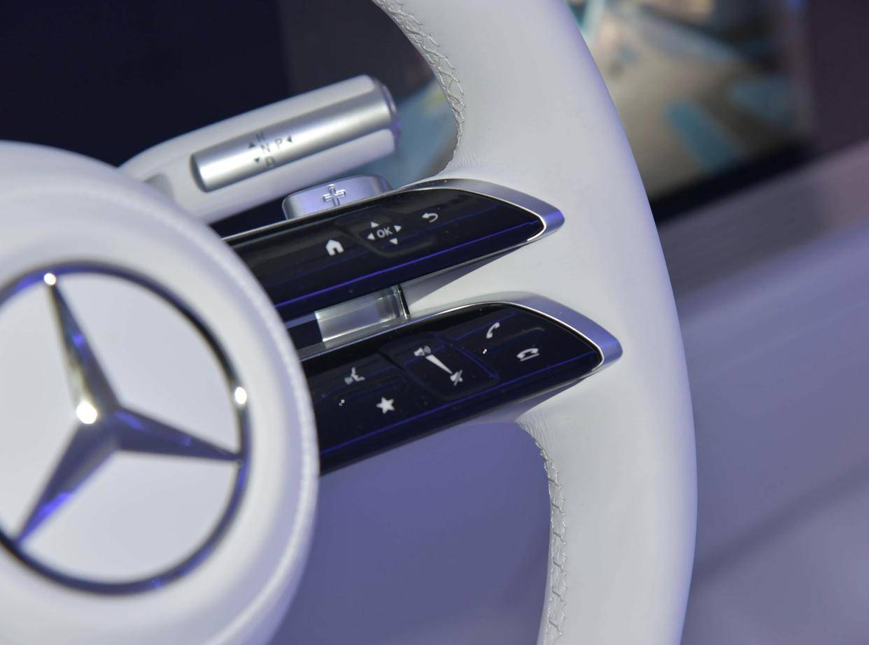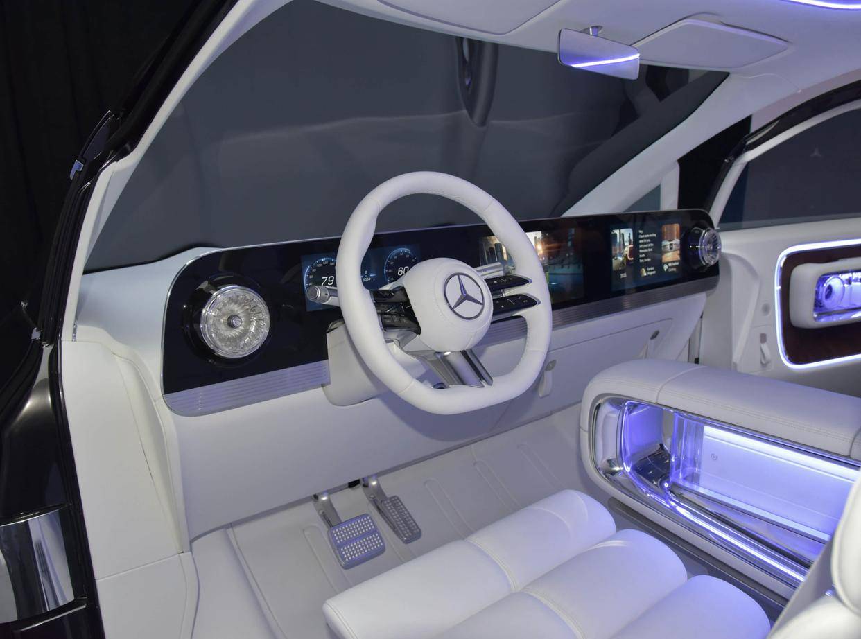 奔驰Vision V概念车座舱内部的设计也十分惊艳,大面积米白色环保软性材质的铺陈,还配备了风格迥异的独立沙发座椅,门板四周还加入了透明的亚克力饰板,可以看到柏林之声高级音响的电路构造,还有随音乐律动的吊顶式氛围灯和侧面氛围灯,前后扶手箱不仅加入了标准的2杯架,还有可制冷制热的冰箱,舒适感配置直接拉满。悬浮式的中控台配备了梅赛德斯标志性的三辐式多功能方向盘,银色的换挡拨片以及经典的怀挡式换挡机构。整个中控台就是一整面带鱼屏,由全液晶仪表、中控液晶屏和副驾驶多媒体搭配组成,最边缘的部分还配备了炮筒式空调出风口设计,科技感十足。