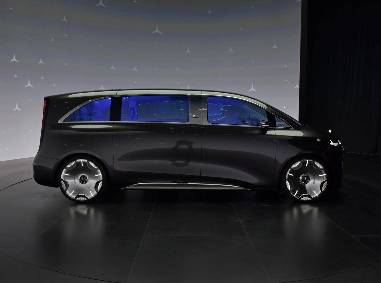 来到车身侧面,奔驰Vision V概念车采用了传统的MPV的吐司面包轮廓,更加倾斜的A柱与弧线形的A柱、弧线形的车顶和略带溜背式的车尾线条巧妙地结合在一起,十分优雅。银质的车窗饰条和加宽的银色B柱,再配上大饼样式的轮圈和电子后视镜设计,带来了豪华商务车的强大气场。隐藏式的门把手设计不仅让车身侧面变得更加简约,也降低了整车的风阻系数,电动侧滑门、迎宾光毯也提升了整车的商务属性。别看它造型十分独特,该车也是经过了了风洞实验,拥有较低的风阻系数。车内最多可容纳8人,从而满足从家庭、休闲到商务等多样化场景需求。