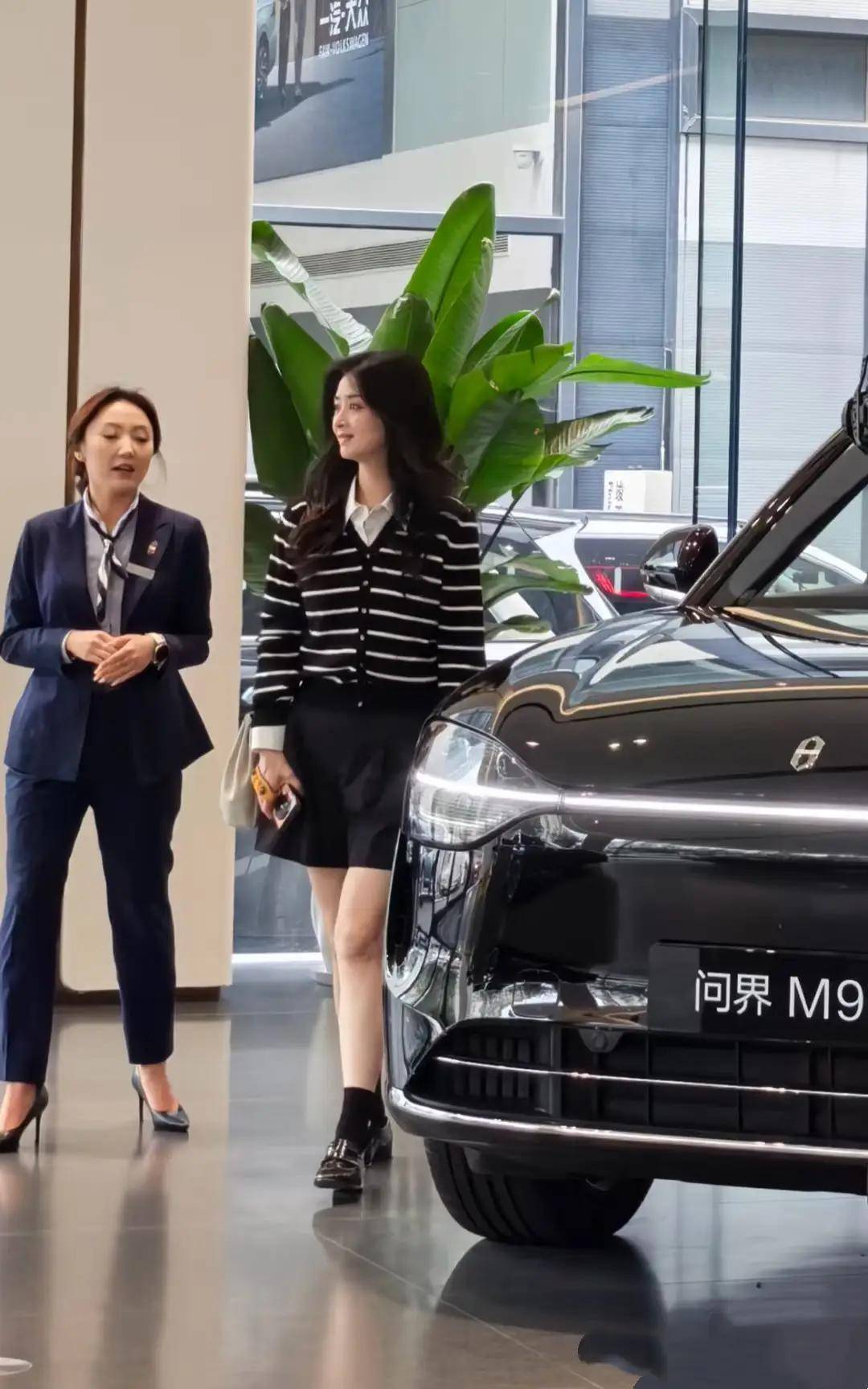 今天刷到网友拍的蒋欣,第一眼没敢认——倒不是瘦得有多惊艳,是这股子“不端着”的劲儿太打眼。素颜扎着半披发,条纹衬叠着白衬衫,在国产车4S店里跟销售凑一块儿看配置单,手指着车后座问“这空间装老人轮椅方便不”,旁边助理就拎个帆布包站在边上,跟街坊邻居周末去看车似的,一点明星架子都没有。