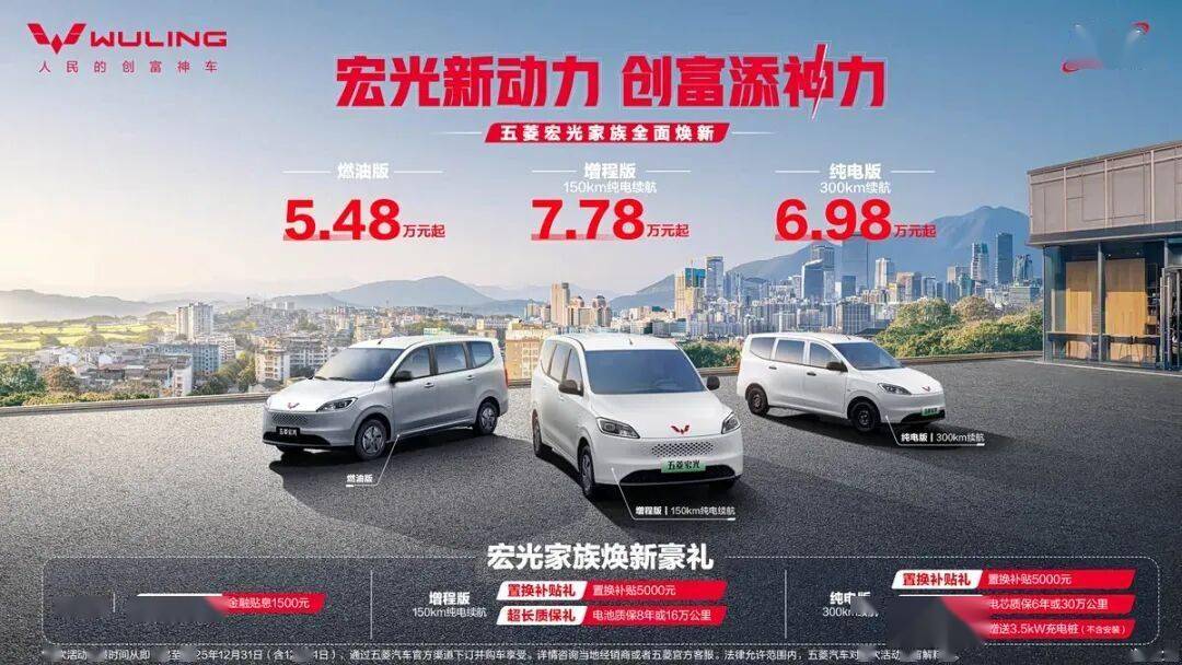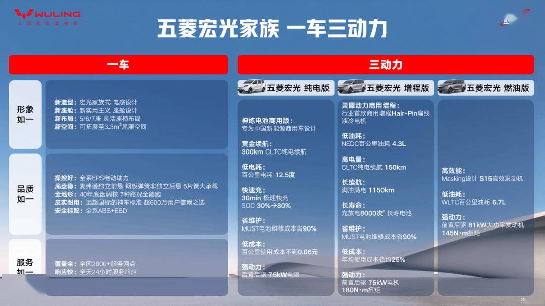 新款五菱宏光家族提供纯电、增程、燃油三种动力总成,纯电版CLTC纯电续航300km,百公里电耗低至12.5度,支持30分钟极速快充(SOC 30%至80%),百公里使用成本不到6分钱,搭配后置后驱75kW强动力电机。