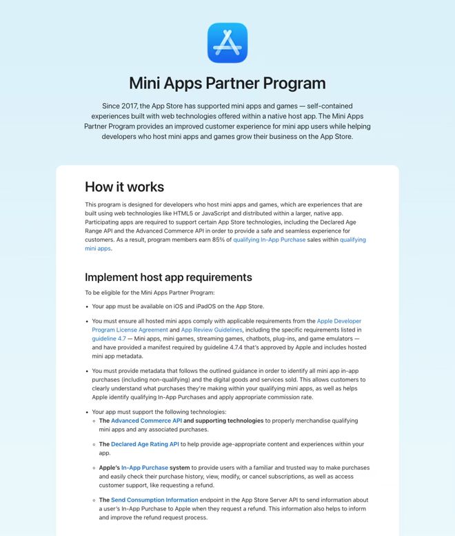 这个计划最核心的信息是:参与计划的开发者,在符合条件的小程序应用内购买销售额中,仅需支付15% 的优惠佣金费率。