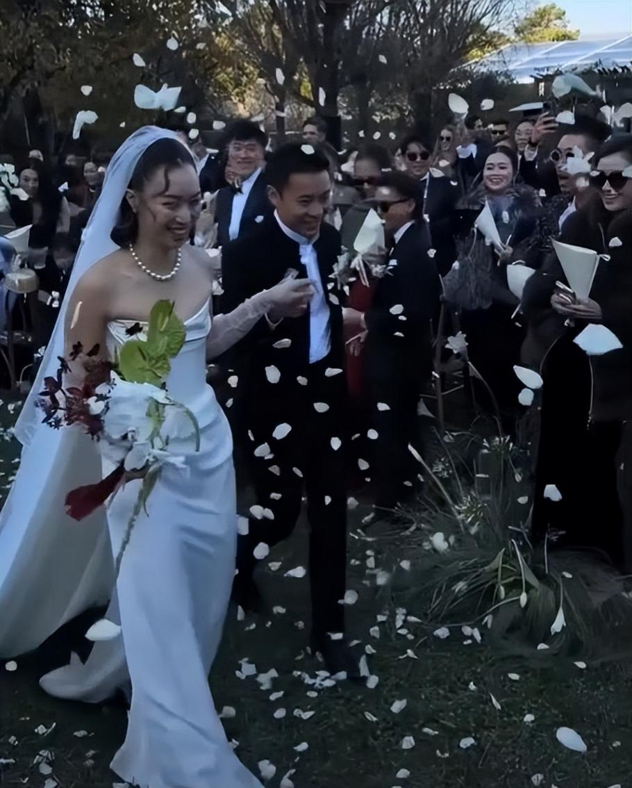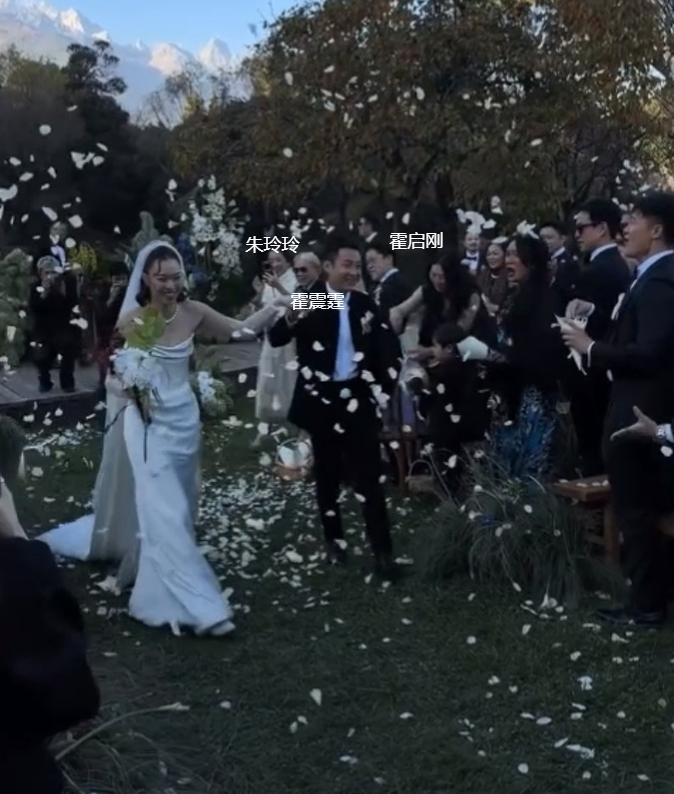 两人完成仪式后,亲友们向他们抛撒花瓣,霍启仁的父亲霍震霆及哥哥霍启刚站在前排位置,霍启刚忙着给弟弟录视频,而母亲朱玲玲身穿白色礼服,也拿着手机给儿子录像。