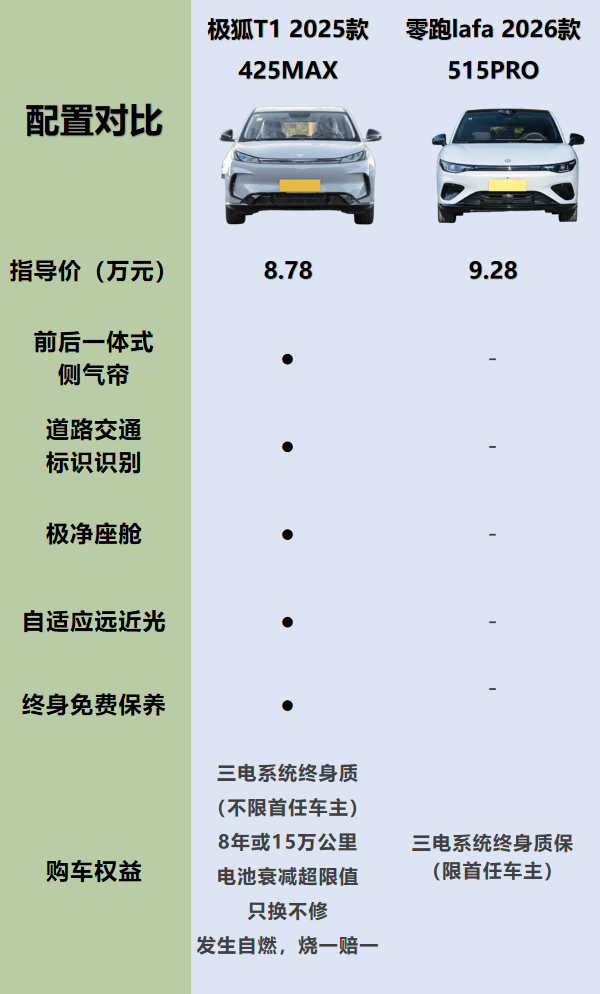 纯电车市场日益激烈的竞争中,消费者对日常出行车型的需求已不再局限于续航里程,而是更关注空间实用性、配置贴心度以及用车安心感。极狐T1和零跑lafa5作为两款备受瞩目的家用纯电车型,各自瞄准了城市通勤与家庭出行的核心场景。今天,我们将从健康座舱、空间表现、智能安全配置以及质保政策等多个维度进行深度对比,看看极狐T1是否能在这些关键领域脱颖而出。值得一提的是,极狐T1不仅在车内用料上追求极致,还提供了多项同级罕见的舒适性配置,而零跑lafa5则显得稍显保守。