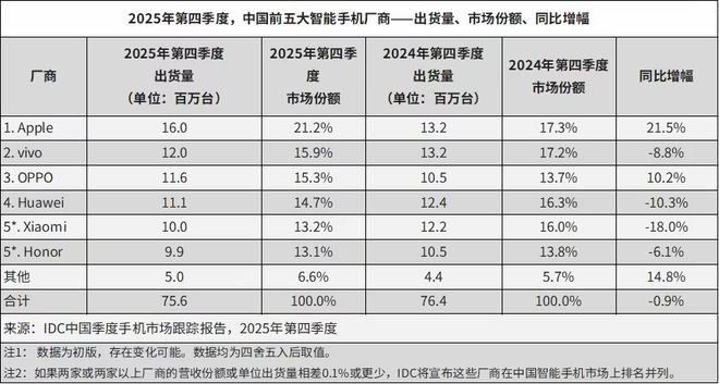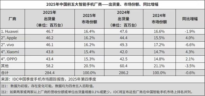 1月20日知名数据分析公司IDC给出了一份智能手机市场分析报告,这个报告是关于2025年国内全年以及第四季度。报告中的数据显示2025年第四季度国内智能手机出货量为7564万台,同比下滑0.9%,全年出货量为2.84亿台,同比下滑0.6%。
