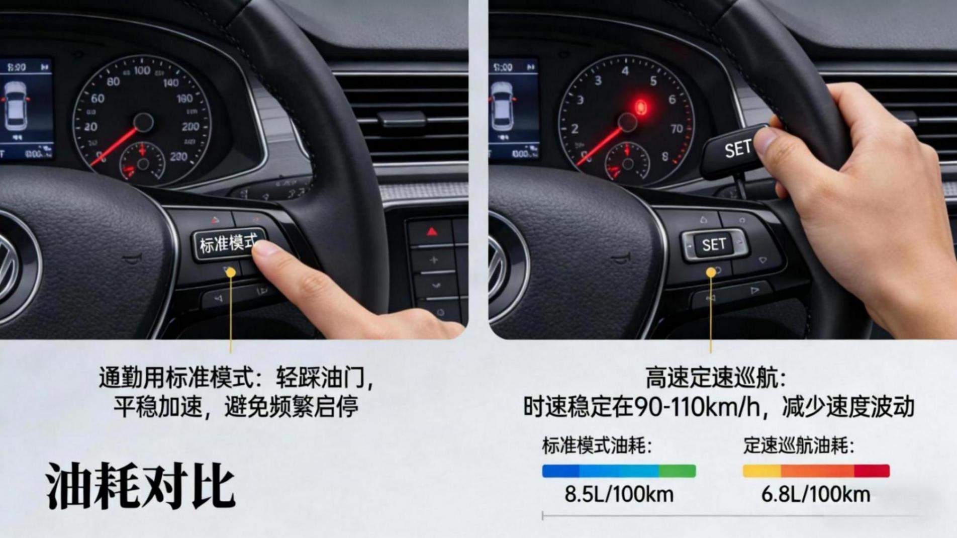 油耗控制 全程市区开运动模式,油耗飙升 通勤用标准模式,高速开启定速巡航 市区油耗降至7.2L/100km,省油12%