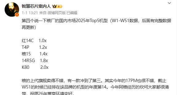 近日,数码博主@智慧芯片案内人 曝光了小米2025年第1周至第51周(近似2025全年)的机型累计销量前五。爆料显示,第一名为REDMI K80。
