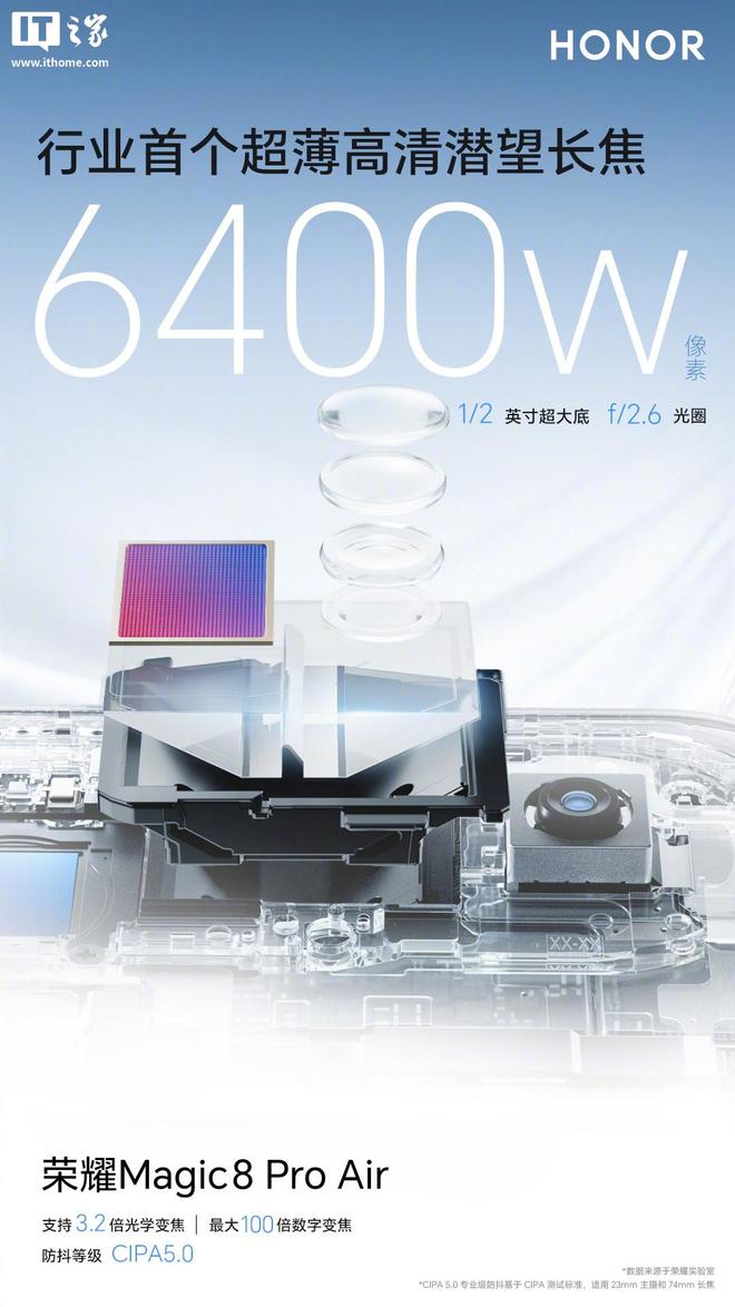 1 月 14 日消息,荣耀手机官方今日宣布,荣耀 Magic8 Pro Air 将搭配旗舰同款大底主摄,同时推出行业首个超薄高清潜望长焦,及安卓首个 AI 变焦阵列闪光灯。具体配置信息如下: